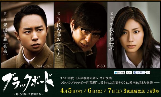 日劇方面我額外推薦《黑板》,這部台灣沒有中譯,是一部三篇特別篇合起來的跨時代日劇,講的是二戰時期、80年代泡沫化、現代三種時空的老師,彼此間是有所連結但不相牽涉的,而翔負責的就是二戰時期的教師,當時他教導軍國主義和提倡為國獻身的精神,可是日本戰敗也導致他幾名學生喪生甚至是殘廢,他在其中所經歷的心路歷程和自我責備恰好呈現出日本人從崇尚戰爭變為後悔戰爭的心情寫照,非常推薦!